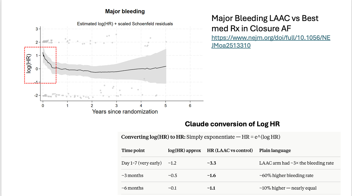Why? In the case of pLAAO, the early signal of increased bleeding is explained by the procedural risks of device implantation and the subsequent intense anticoagulation regimen. See the figure below from CLOSURE-AF trial, which demonstrates early separation of the curves too. Procedural interventions inherently carry risks, and it is not uncommon to observe initial harm following such procedures.