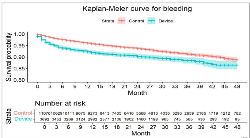 Second, the higher bleeding rate observed with pLAAO in our study is noteworthy. This can be explained by the fact that patients typically receive intensified “blood-thinning” therapy in the first few weeks after device implantation to prevent clot formation on the device, which increases bleeding risk