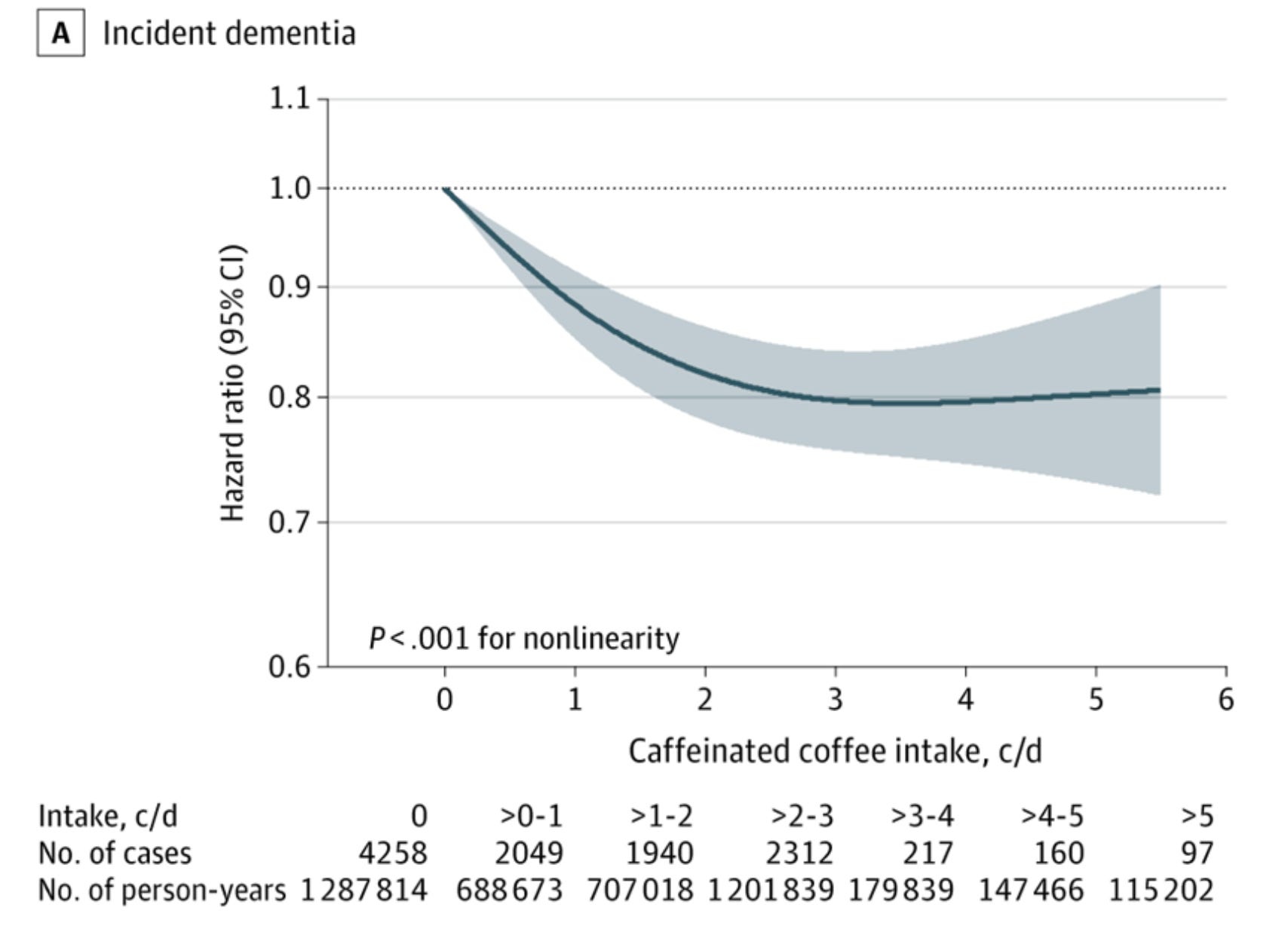 Higher caffeinated coffee intake was significantly associated with lower dementia risk (141 vs 330 cases per 100 000 person-years comparing the fourth [highest] quartile of consumption with the first [lowest] quartile; hazard ratio, 0.82 [95% CI, 0.76 to 0.89]) and lower prevalence of subjective cognitive decline (7.8% vs 9.5%, respectively; prevalence ratio, 0.85 [95% CI, 0.78 to 0.93]).