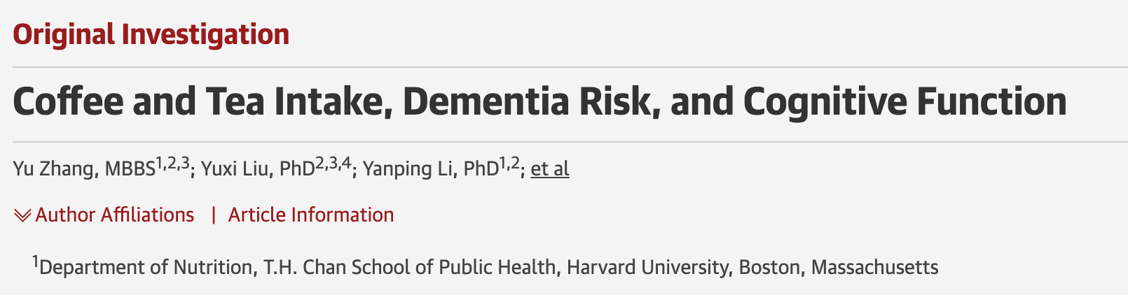 You should pause there to Stop and Think. Dementia and cognitive decline are highly complex conditions caused by many different conditions, ranging from either vascular disease, bleeding conditions, genetic disorders, toxic exposures or the combination of these. Your Bayesian prior that exposure to one food (coffee) could influence this sea of complexity should be very low.