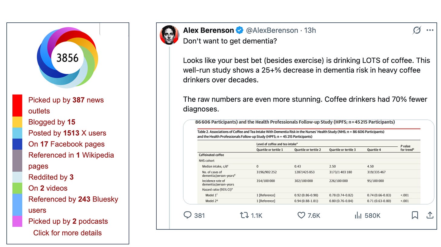 The media reaction is stunning. Nearly 400 news outlets and 1500 X users mentioned the study. I scanned the news stories; almost all were positive.