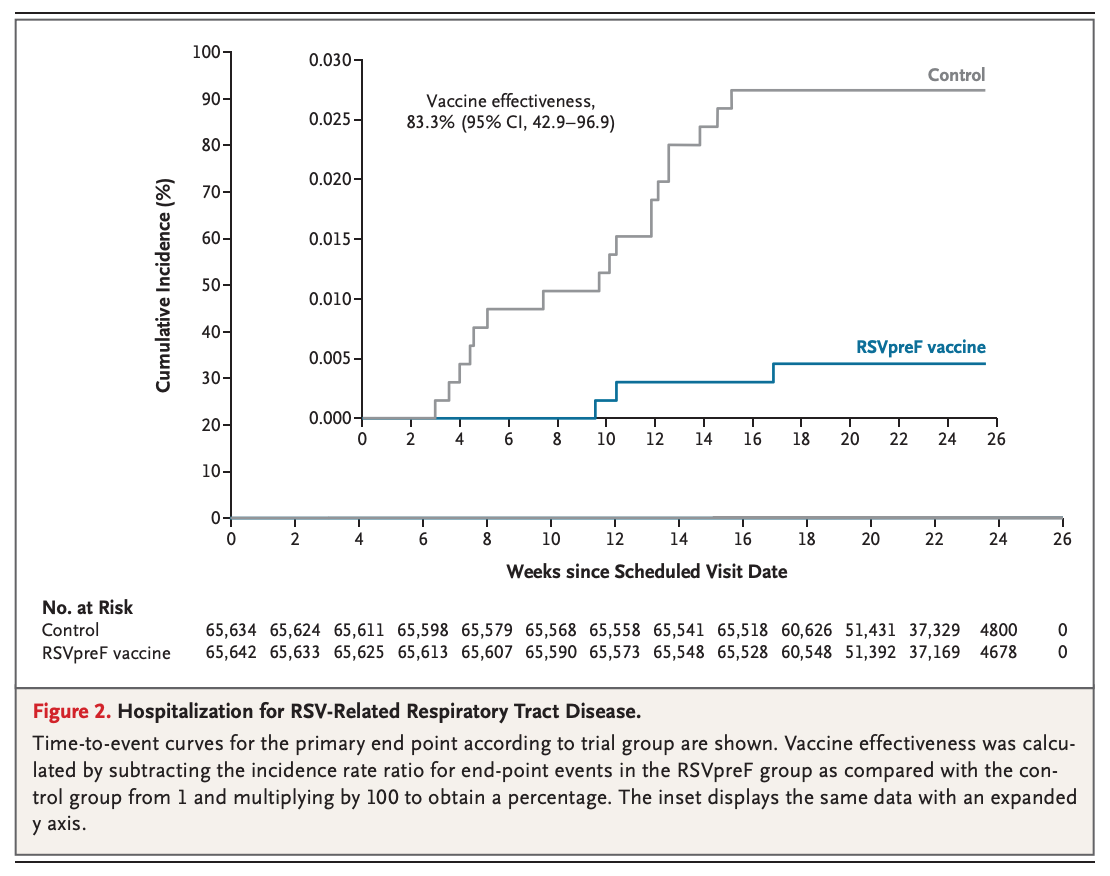 The NEJM article described a beautifully conducted RCT in which 131,276 people were randomized to receive the RSV vaccine or remain unvaccinated (no diluent or saline comparator here). The primary endpoint was hospitalization for RSV-related respiratory tract disease. The secondary endpoint was hospitalization for RSV-related lower respiratory tract disease and hospitalization for respiratory tract disease from any cause.
