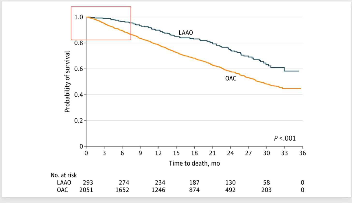 HR was 0.47 (95% CI 0.30-0.72). I added the red square, which shows immediate separation of the survival curves, implying that LAAO confers an immediate survival advantage.