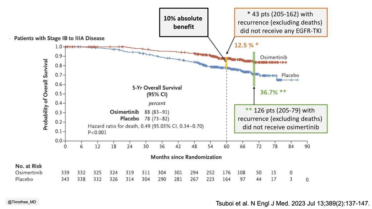 In short, there is a 5-year 10% absolute survival benefit; however, 36.7% of patients in the control arm relapsed and did not receive osimertinib. Being less restrictive, if you consider any EGFR-TKI, rather than just osimertinib, 12.5% of patients did not receive one upon recurrence. Would the survival gain be present had these patients had access to osimertinib or other TKIs?