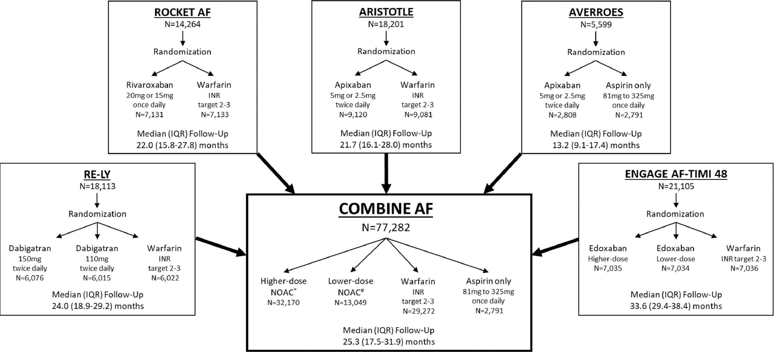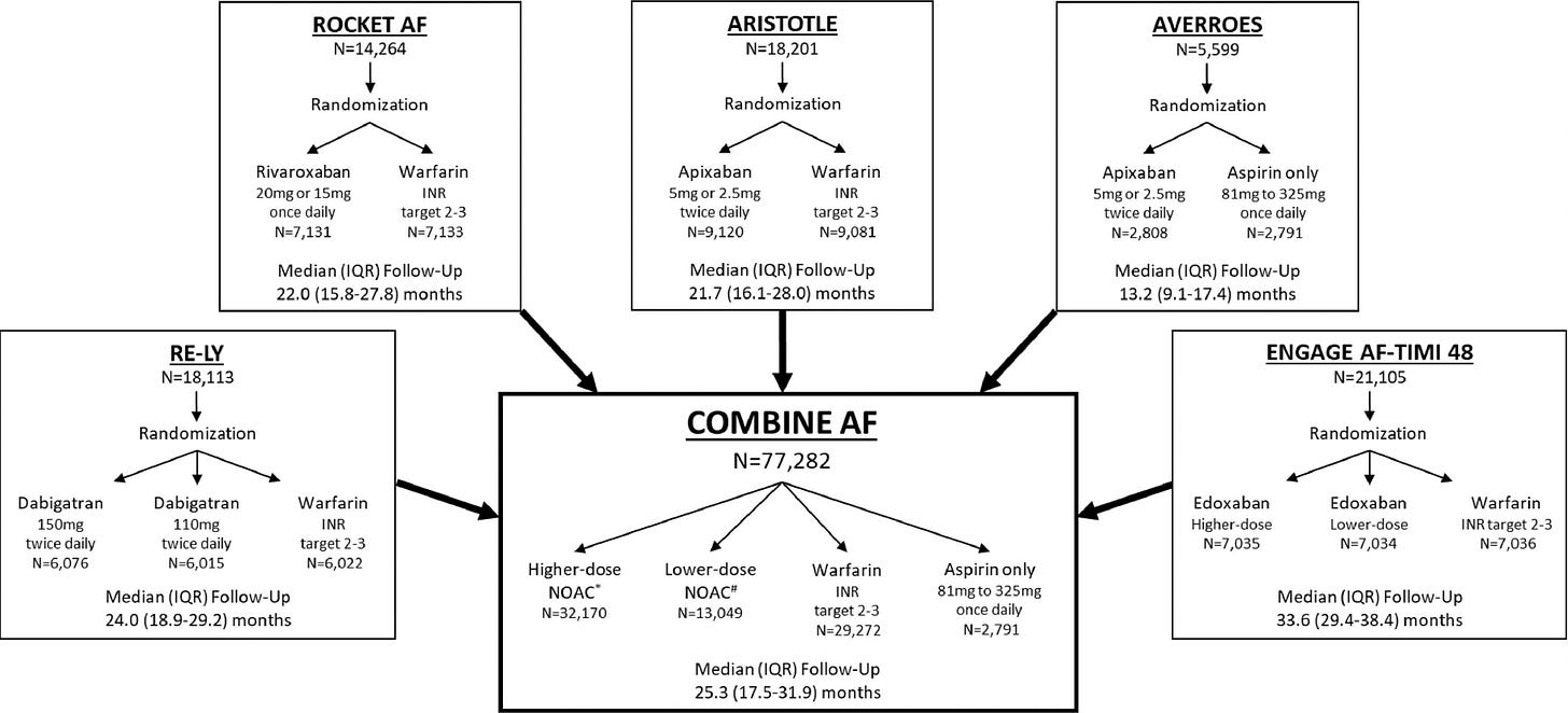 Authors from the big four DOAC vs warfarin trials have collaborated to share patient-level data. The COMBINE AF collaboration is a powerful dataset comprising nearly 77,000 patients in the RELY (dabigatran), ROCKET (rivaroxaban), ARISTOTLE (apixaban) and ENGAGE AF-TIMI (edoxaban) trials. You can do a lot with this sort of data:
