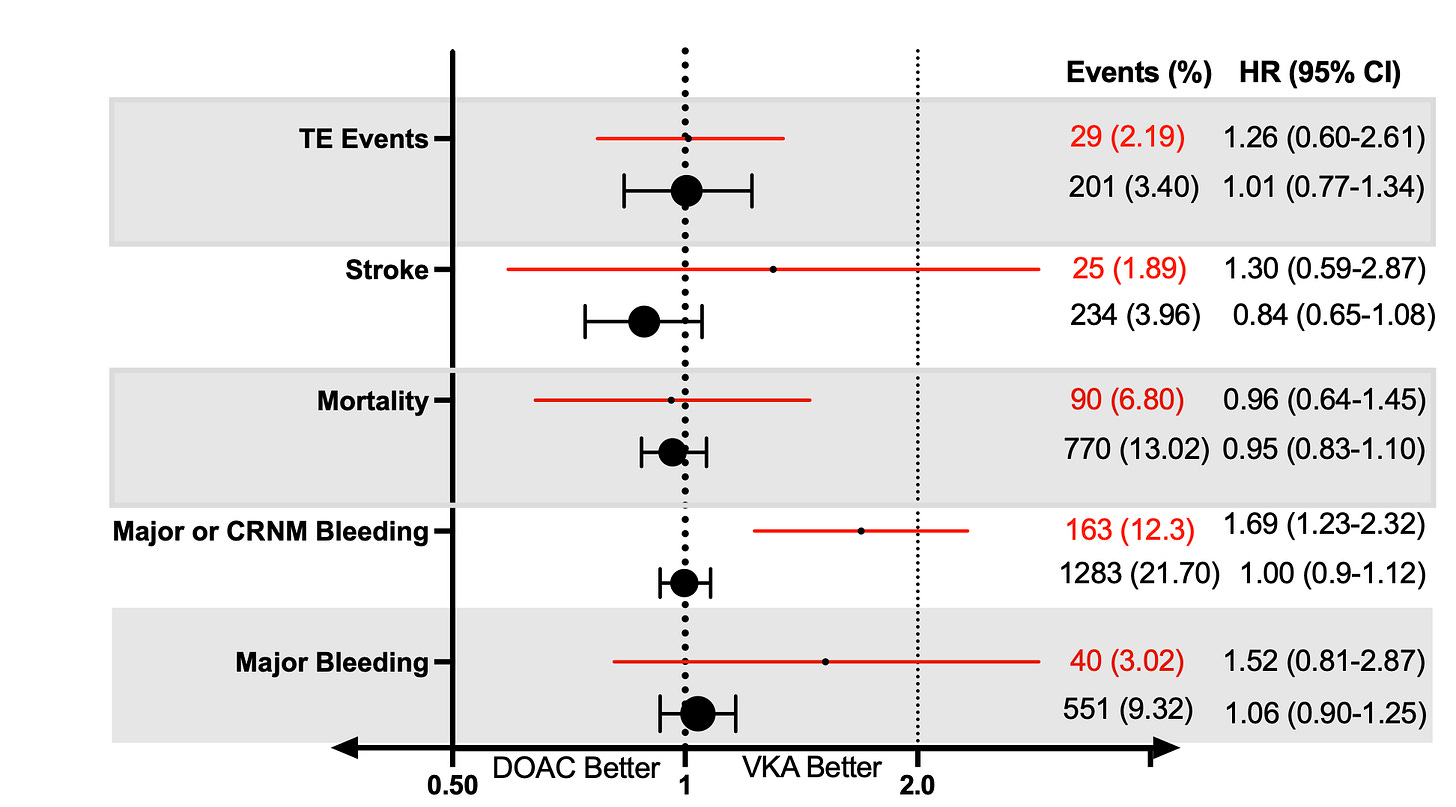 Last week, a group of authors from Boston published a clever analysis of the DOAC vs warfarin trials in an effort to replicate the FRAIL AF study—which tested the question of whether older patients with frailty should be switched from vitamin K antagonist (VKA) to direct acting oral anticoagulants (DOAC). (Note: the most common VKA in the US is warfarin, but in Europe, a drug similar to warfarin called phenprocoumon is also used.)