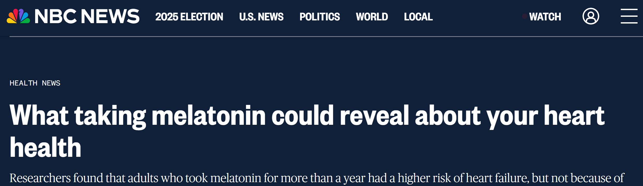 2) In the words of the study's author, "Worse insomnia, depression/anxiety or the use of other sleep-enhancing medicines might be linked to both melatonin use and heart risk....our study cannot prove a direct cause-and-effect relationship....This means more research is needed to test melatonin’s safety for the heart.”