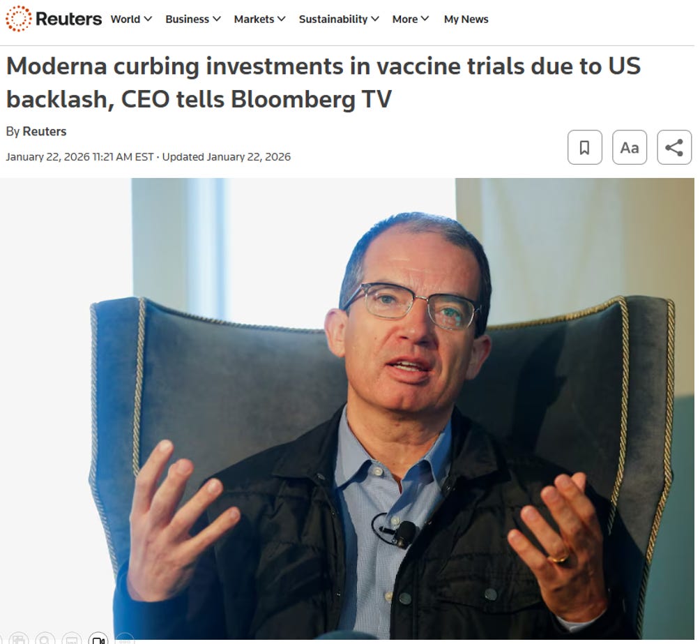 Lost in the latest news cycle was a stunning report from Reuters that has generated some buzz on X. Speaking from the World Economic Forum in Davos on January 22, CEO Stephane Bancel told Bloomberg TV that “Moderna does not plan to invest in new late-stage vaccine trials because of growing opposition to immunizations from U.S. officials.”