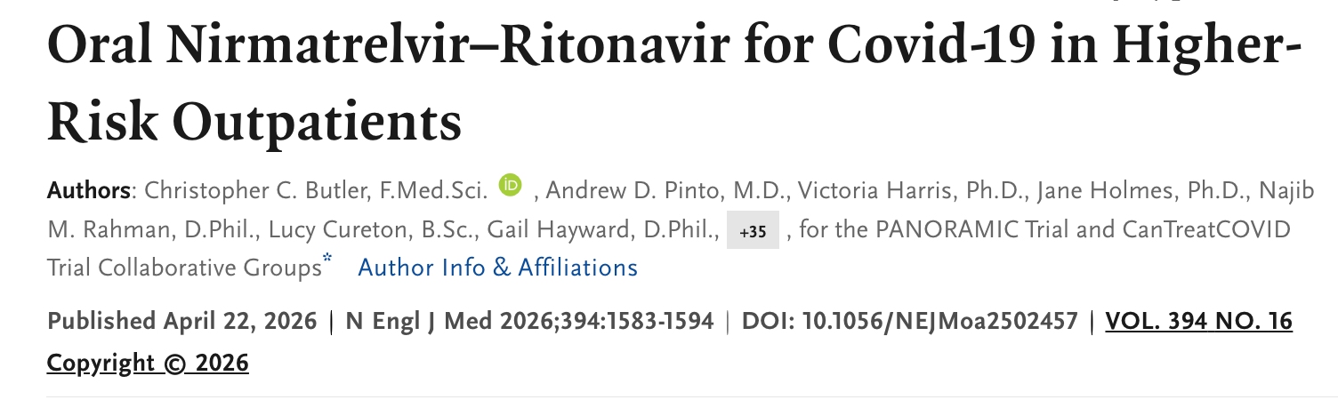 The NEJM manuscript published last week included results of the British PANORAMIC and Canadian CanTreatCOVID trials. Both enrolled higher risk older patients with a coexisting condition who tested positive for SARS-CoV-2 and had been unwell for 5 days or less.