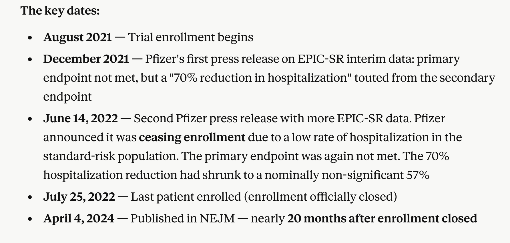 It's mid 2026 and NEJM publishes another decidedly negative Paxlovid trial. A couple of lessons emerge: one about evidence expiration dates and the other about incentives to delay trial publication