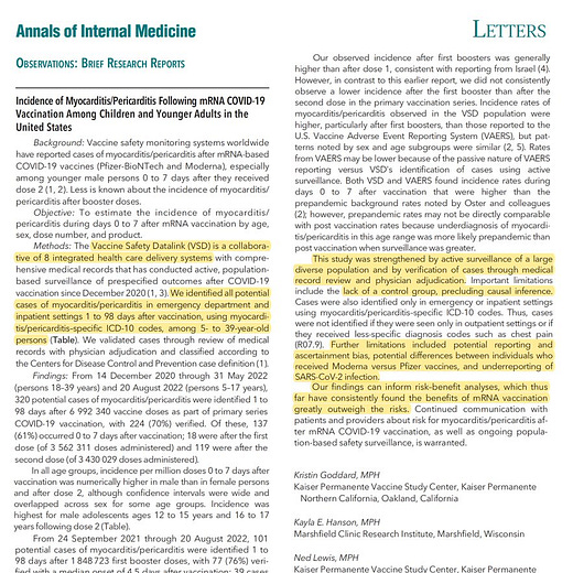 Our analysis is the first to prove that one can minimize mRNA myocarditis by failing to break it out by basic demographics. This was a common error sadly during the pandemic. Please read and share our paper. I think you will find the discussion fair and balanced.