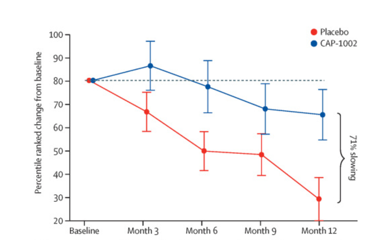 It showed a mean 12-month change from baseline in mid-level PUL 1.2, favoring CAP-1002 over placebo (percentile difference 36.2, 95% CI 7.9–64.5; difference of 2·6 points; p=0·014). “This finding represents a clinically significant 71% slowing of loss of function with CAP-1002.”