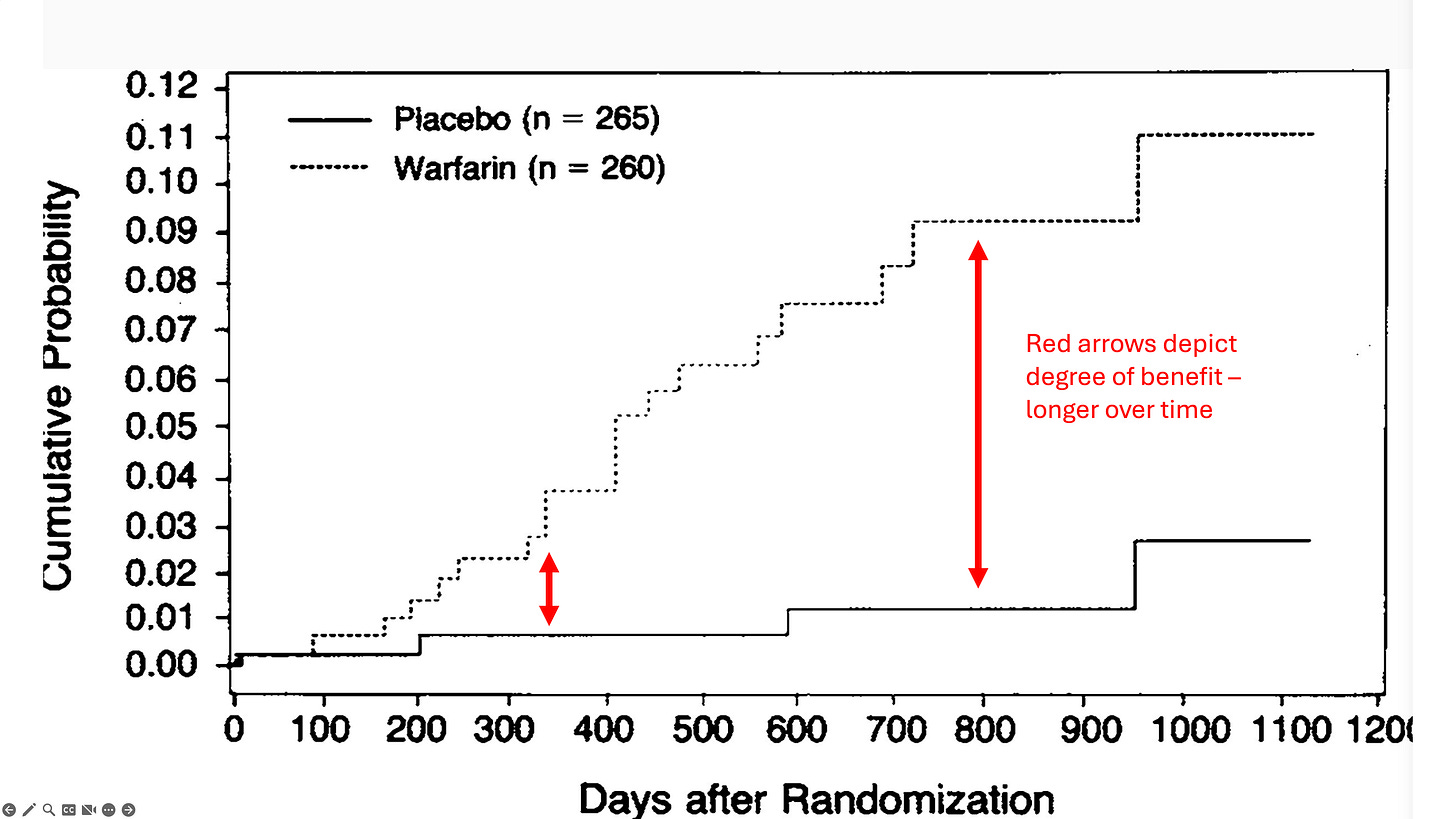 The picture shows how time enhances benefit of stroke prevention in the SPINAF trial of warfarin vs placebo in patients with AF. Note the difference in event rates at one year vs 3 years.