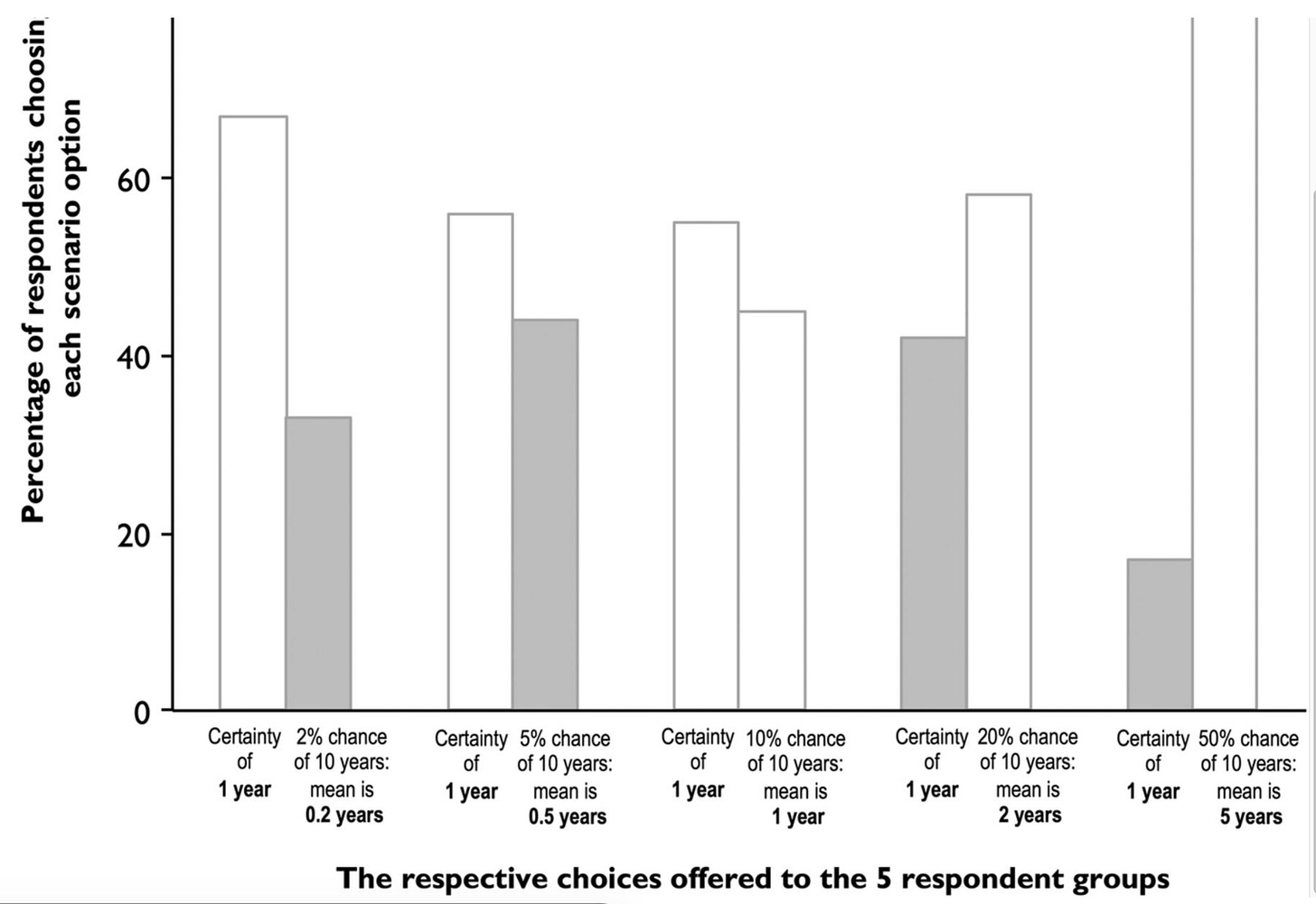 The UK team actually went out into London tube and asked random people their preferences on maximizing lifespan. Each person chose between the certainty of 1 year gain or a % chance of 10 years gain.