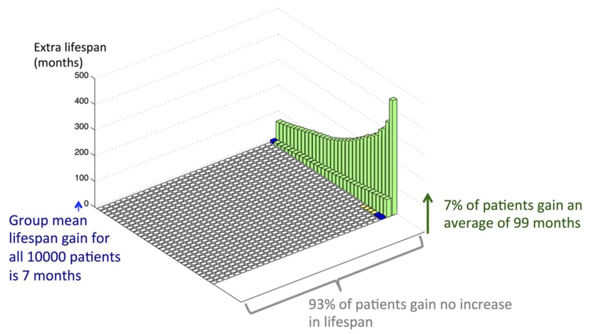 Notably, the great majority of men (93%) gain no lifespan while the minority that do gain, gain much more than the group average.
