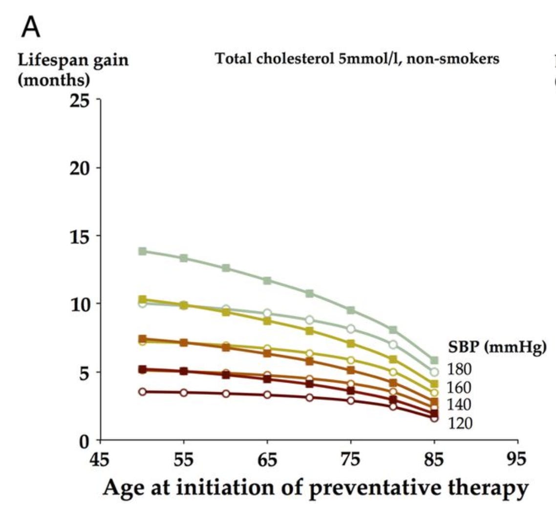 For example, for a 50-year-old, non-smoker, non-diabetic man with average cholesterol and BP, mean life expectancy gain is 7 months starting preventative therapy. However, among such individuals, 93% gain no extra lifespan, but the remaining 7% gain an average of 99 months.