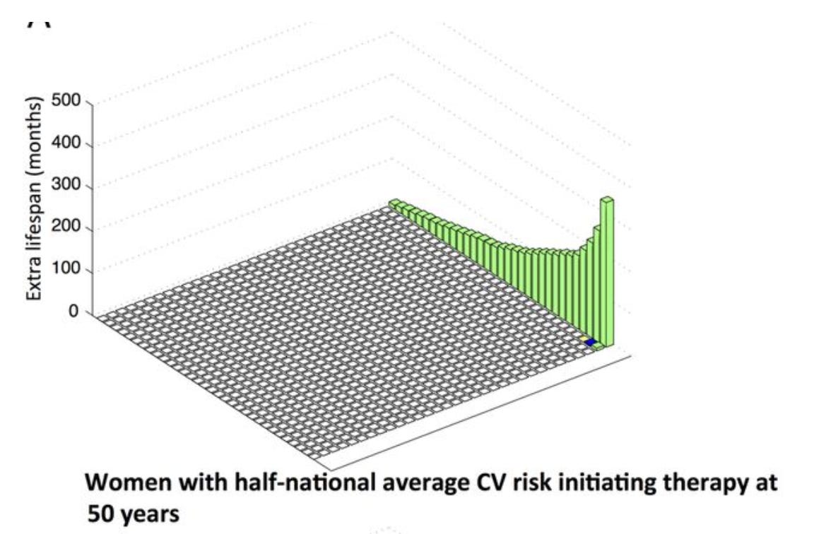 These distributions change according to baseline risk and when a primary prevention therapy is started. For instance, for women with half-national average CV risk initiating therapy at 50 years, the mean life expectancy gain is 3 months, 96.6% gain no extra lifespan, but the remaining 3.4% gain an average of 92 months.