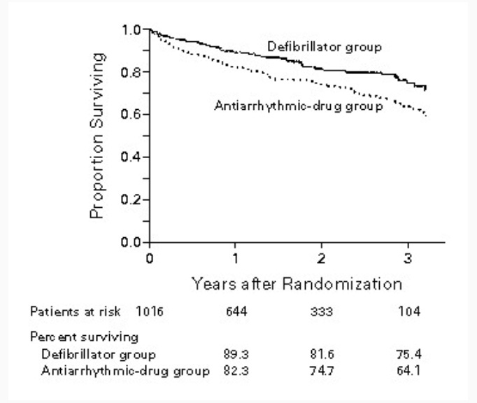 The AVID trial compared ICDs to amiodarone. AVID established the ICD as the superior treatment as it reduced death by a whopping 39% in relative terms. The absolute risk reduction was huge at 8%. An NNT of only 12 patients—much lower than statins.