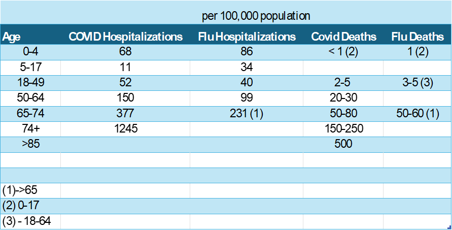 There are COVID-related hospitalizations in young children: 68/100,000. The numbers were much higher for older adults (and were more common for COVID than for flu). In kids, the rate of hospitalization for flu and COVID was similar. It is true that flu vaccination is recommended for young children. Those recommendations are based on vaccine-related reductions in flu incidence and modest reductions in influenza-like illness. There is no evidence that flu complications are affected by the vaccination. (Perhaps calls for flu vaccination in young children are also excessive…)