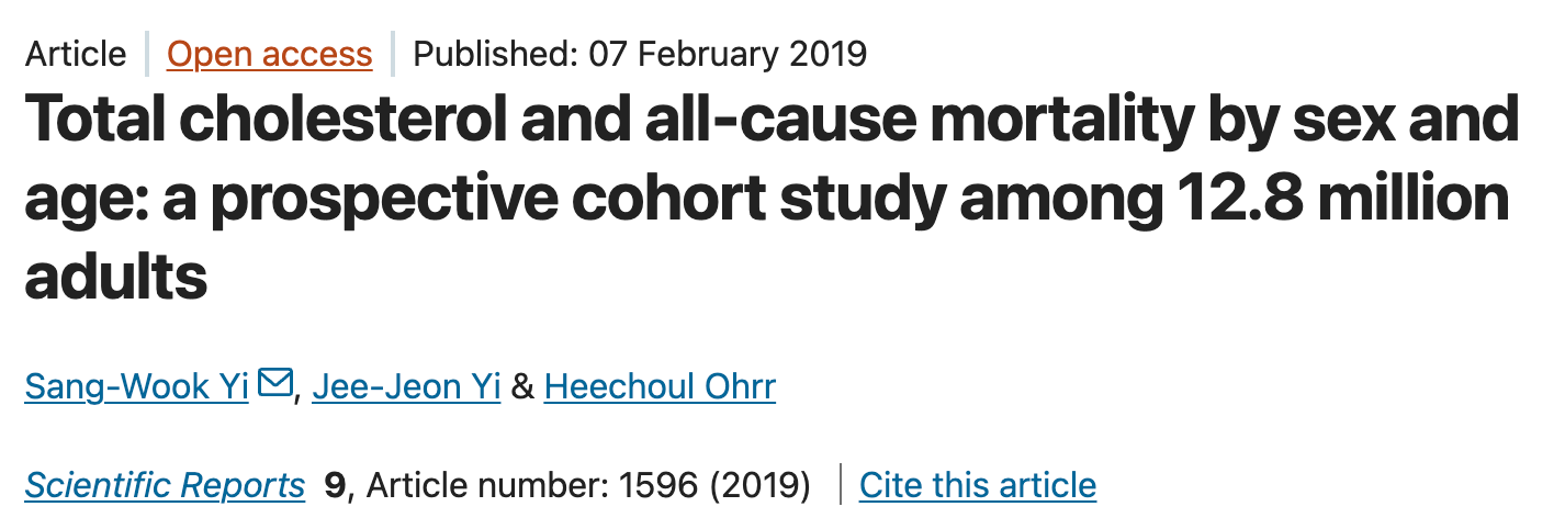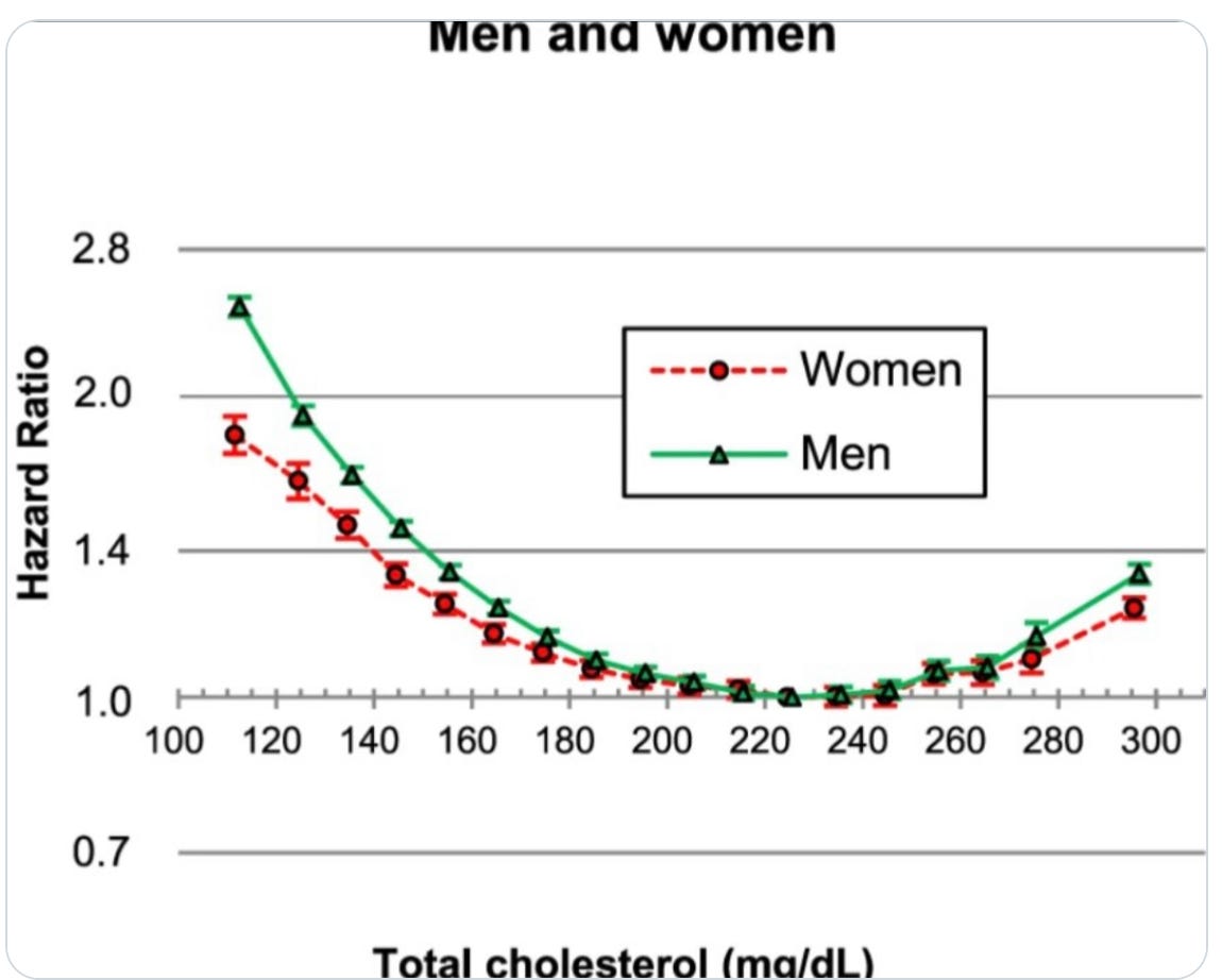 The author is wrong in his statement that there are many studies showing taking statins leads to lower all cause mortality. There is at least one meta study that looked at 29 RCT done by the drug companies and in 27 of the 29 studies there was zero mortality benefit. IE the folks on Statins did not die less. So given that the author would state something so obviously wrong destroys the entire credibility of this article. Maybe the NIH should do a study that studies the effect of low cholesterol on overall mortality in a large population. As to the authors statement that the study did adjust for a whole host of other factors. If you have a population of over 13 million you have enough data not to need those factors because you’re observing the whole. If your study is on only a few hundred or even a few thousand. Then you would need to take those factors into consideration. Because one observation out of 100 can skew your results it’s called the law of big numbers. One more example of the author gas lighting in this article. One a grading scale. I am giving this one an F for attempting to gaslighting and ignoring reality.