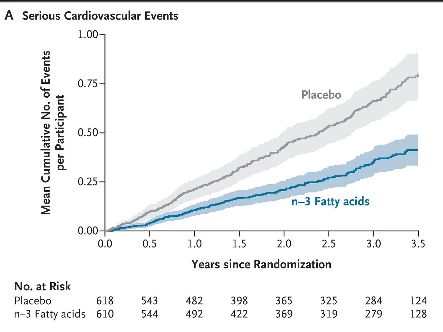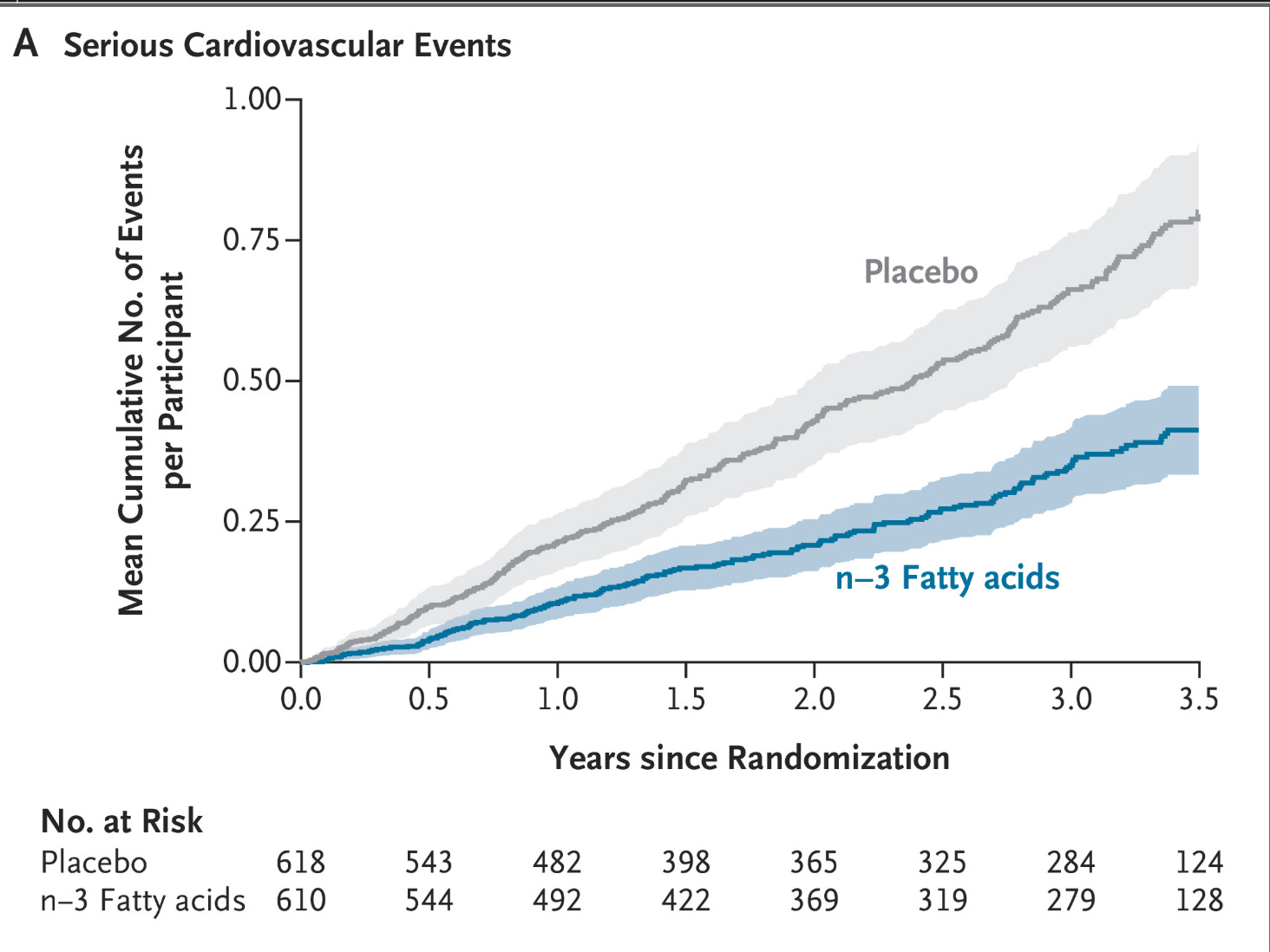 The percentage of patients with at least one cardiovascular event appeared to be lower in the fish-oil group (20.8% [127 of 610 participants]) than in the placebo group (33.7% [208 of 618 participants]). The absolute risk reduction was 12.9%, leading to a number needed to treat to prevent one cardiac event of only 8 patients.