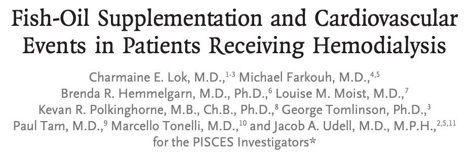 NEJM published the dramatically positive PISCES trial of fish oil vs placebo (corn oil) in patients with end stage kidney disease on hemodialysis last week. I wrote a column on it for theHeart.org