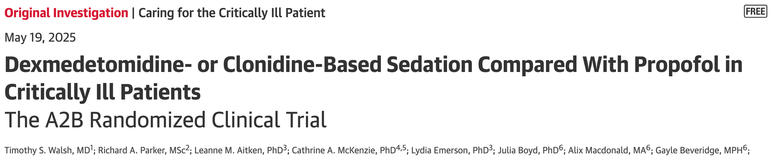 Propofol has some downsides, so a group led by a team in Edinburgh Scotland designed a three-way comparison of dexmedetomidine, clonidine vs propofol. Dexmedetomidine and clonidine are called α2-adrenergic receptor agonist–based sedation agents. (You might recognize dexmedetomidine by its brand name of Precedex.)