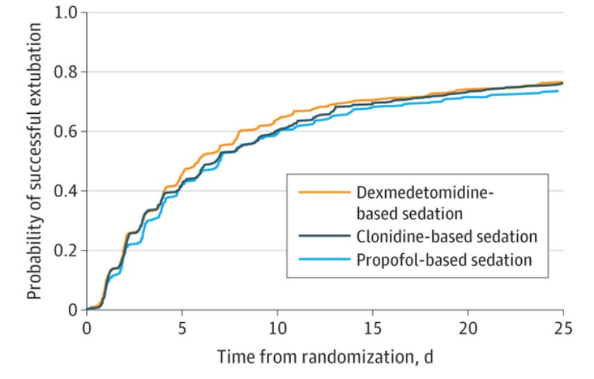 Second, patients in the dexmedetomidine and clonidine groups were allowed to receive propofol doses to achieve proper sedation. And more than 75% of patients on the α2-adrenergic receptor agonist–based received lower doses of propofol. Clinically, THIS IS FINE, but from a trial point of view, it creates added noise because the sole way the two α2-adrenergic receptor agonists reduce extubation time is by allowing patients to have lighter sedation and less respiratory suppression.
