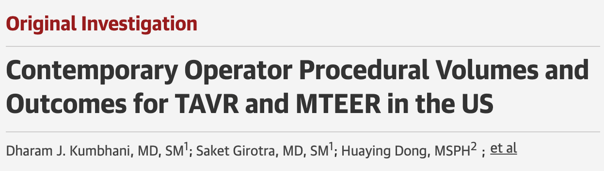 Given these two ideas, let’s look at a nice observational study published in JAMA Cardiology regarding procedural volume and outcomes for two of the more complex procedures in cardiology—TAVR and M-TEER. (TAVR = transcatheter aortic valve implantation and M-TEER = mitral valve transcatheter edge-to-edge repair, AKA, mitral clipping.)