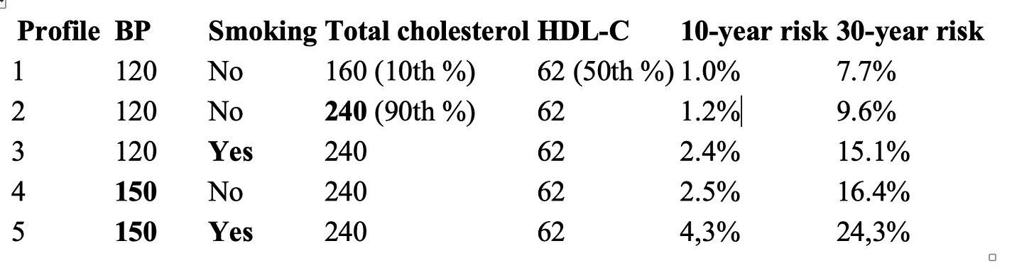 Only the accumulation of several risk factors (profiles 3 to 5) results in a markedly elevated projected 30-year risk. In these cases, lipid-lowering may be a reasonable strategy to mitigate future risk. However, the evidence remains lacking, and smoking cessation or blood pressure reduction may be more appropriate initial steps.