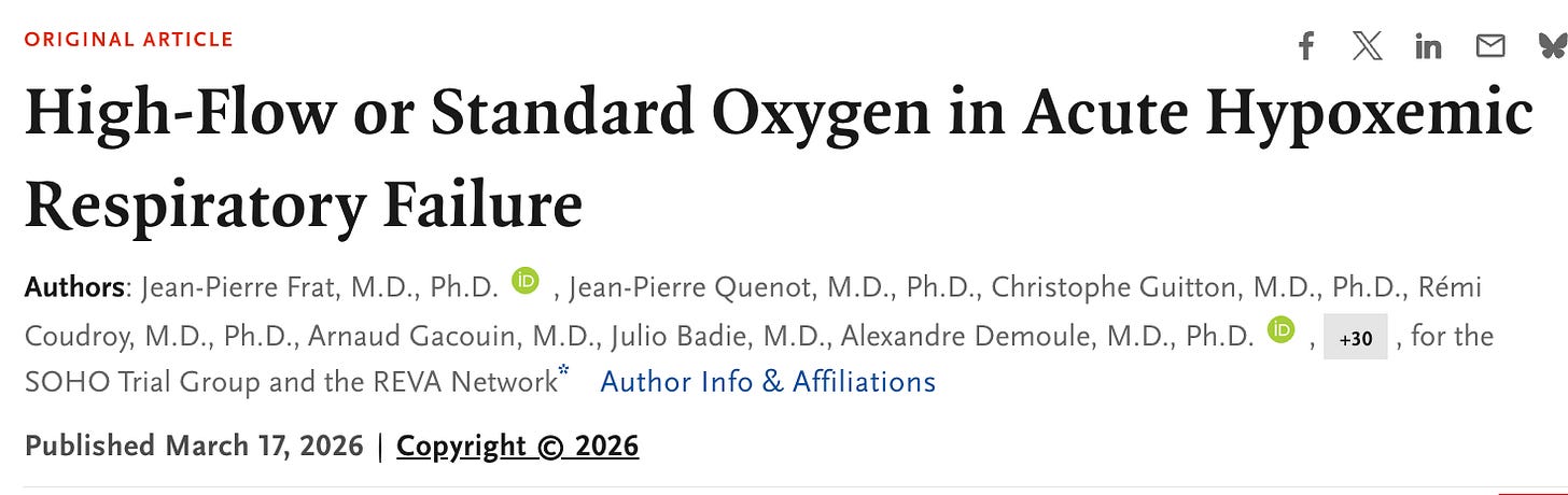 Enter the SOHO study published this month in the NEJM. High-flow vs standard oxygen in 1116 patients with respiratory failure in French ICUs.