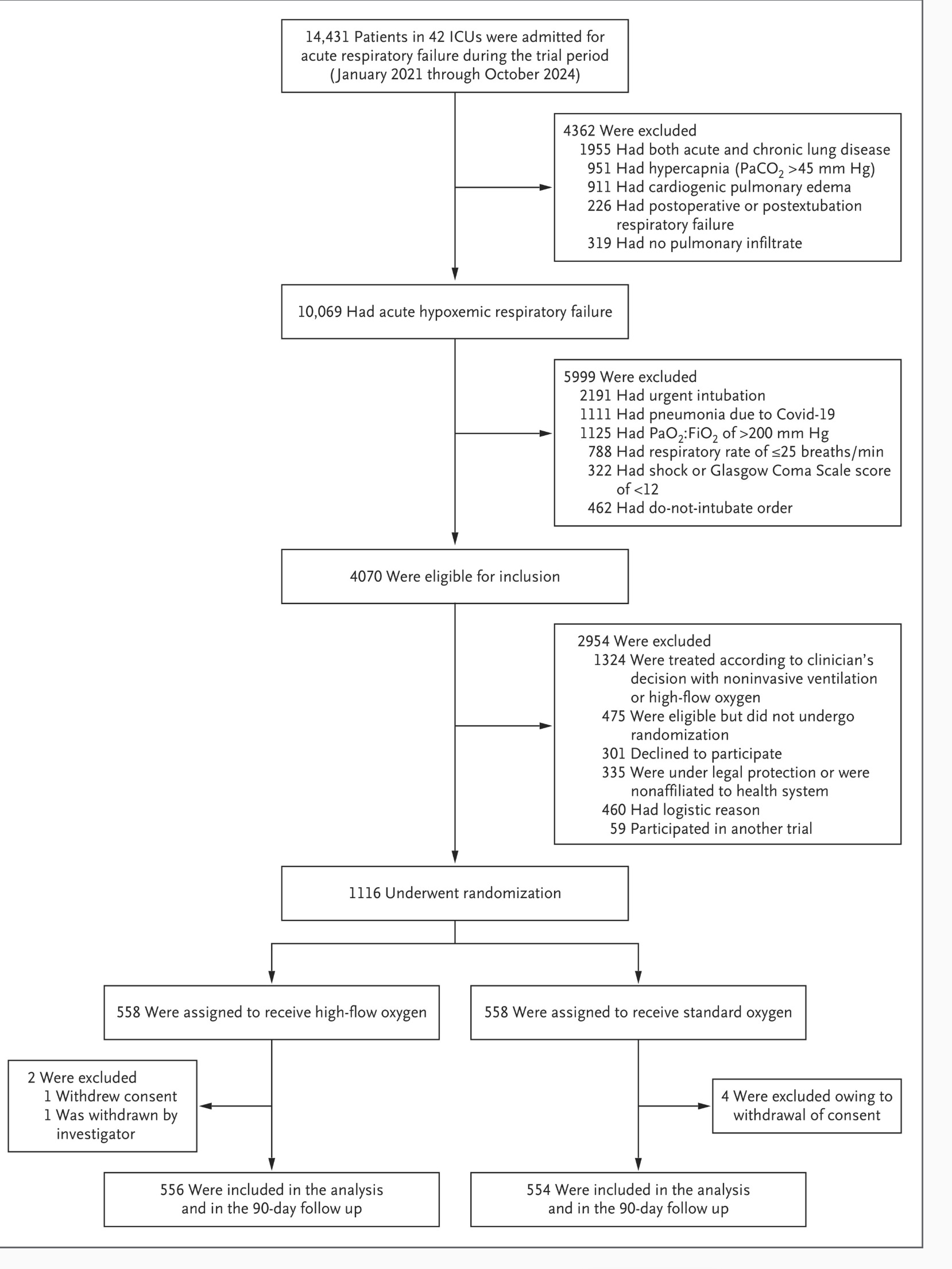 More than 14k patients were admitted to 42 ICUs. 10K had respiratory failure with low oxygen. Nearly 6000 of these were excluded for various reasons, such as the need for urgent intubation or shock. This left 4000 patients eligible for the trial. But only 1116 of these were enrolled. More than a thousand were excluded due to clinician’s preference for high-flow oxygen. This is what happens when a therapy gets established. A jargon-like name is erosion of clinical equipoise, which can occur when practices are established on weak data.