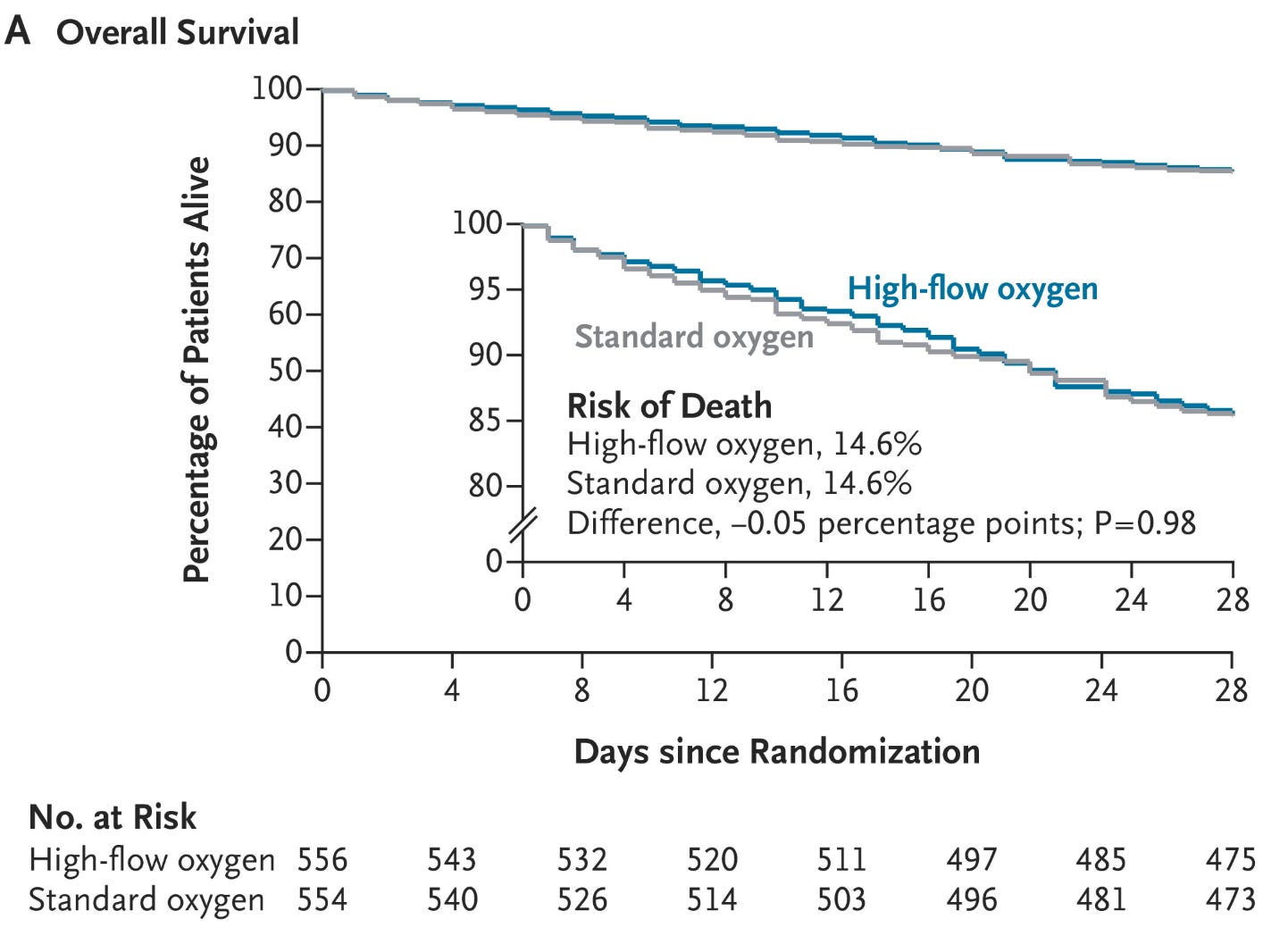 The primary endpoint was as null as null can be: 14.6% (81 of 556 patients) in the high-flow-oxygen group and 14.6% (81 of 554 patients) in the standard-oxygen group (absolute difference, −0.05 percentage points; 95% confidence interval [CI], −4.2 to 4.1; P=0.98).