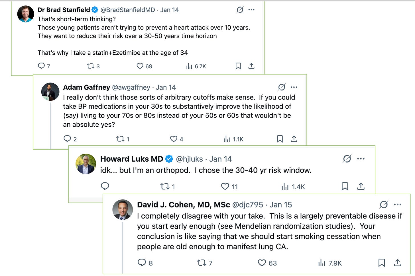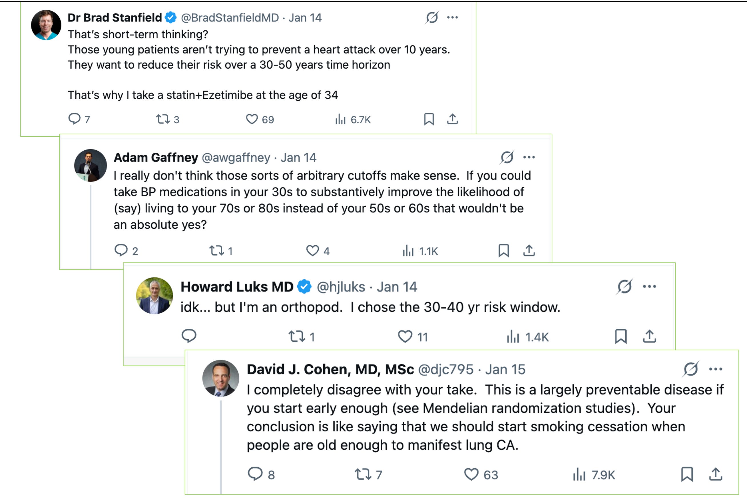My colleagues rightly point out that atherosclerosis of the coronary arteries is a slow process and longer exposure to lower LDL-c is beneficial. They feel that the 10-year horizon is too short. They cite something called Mendelian randomization studies which find that people who were born with genetic profiles that cause low cholesterol also have low rates of heart attacks.