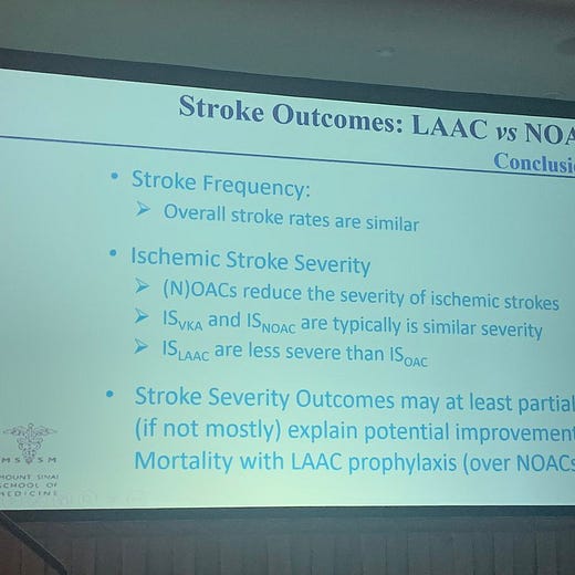 Vivek Reddy, MD is one of the main trialists studying appendage closure. In his slide, he cites this study and the one I discussed last week. He adds caveats, but proposes that a reduction in stroke severity may be the reason why mortality decreases.