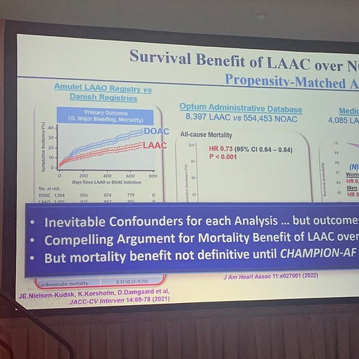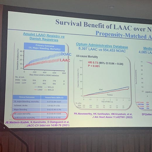 But that is surely wrong, as I showed last week, the LAAOS III randomized trial of surgical closure vs no closure, actually did show less stroke with closure, but it wasn’t enough to budge mortality rates.
